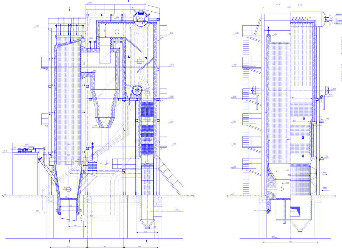 工作流程: 燃料通過輸送機送入爐膛,在密相區(qū)與空氣混合,流化并燃燒,高溫?zé)煔鈹y帶大量正在燃燒的固體顆粒沖刷稀相區(qū),一邊燃燒,一邊將燃燒釋放的熱量傳遞給受熱面,加熱工質(zhì)(水),未燃燼的固體顆粒進入分離器,被收集下來,通過返料器重新送回密相區(qū),循環(huán)燃燒,從而提高燃燒效率。燃燼的固體細(xì)小顆粒隨高溫?zé)煔馓右莩龇蛛x器,沖刷對流受熱面和尾部受熱面,經(jīng)除塵器除塵后排入大氣。