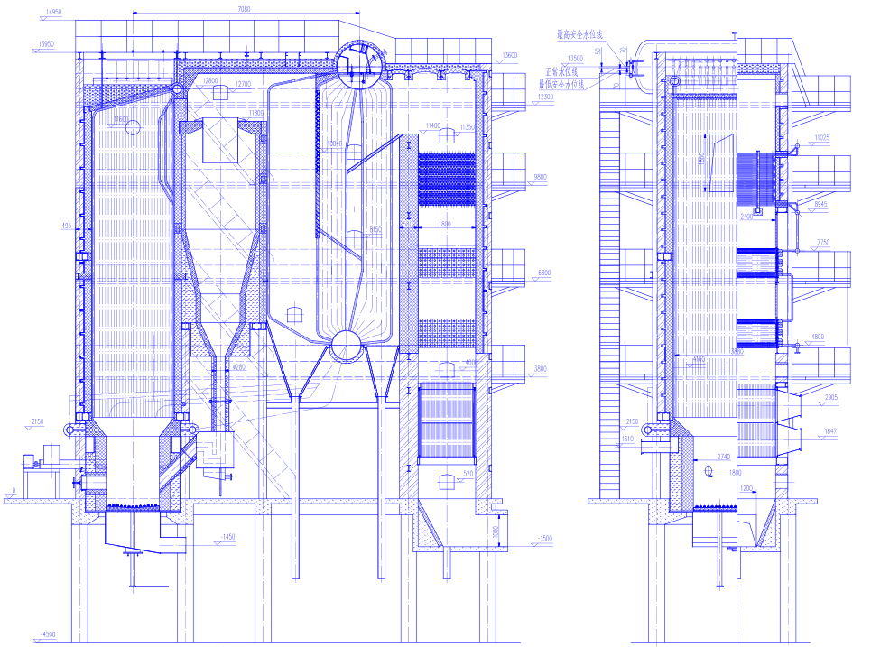 SHX30-1.25-AII 鍋爐為雙鍋筒橫置自然循環(huán)鍋爐,鍋爐房雙層布置,鍋爐運轉(zhuǎn)平臺高度一般為4500mm。鍋爐本體基本尺寸:鍋爐上鍋筒為Φ1400×16,中心標高13500;下鍋筒為Φ900×14,中心標高4800,安裝完畢后外圍尺寸為13940×8470×14900(長×寬×高)。