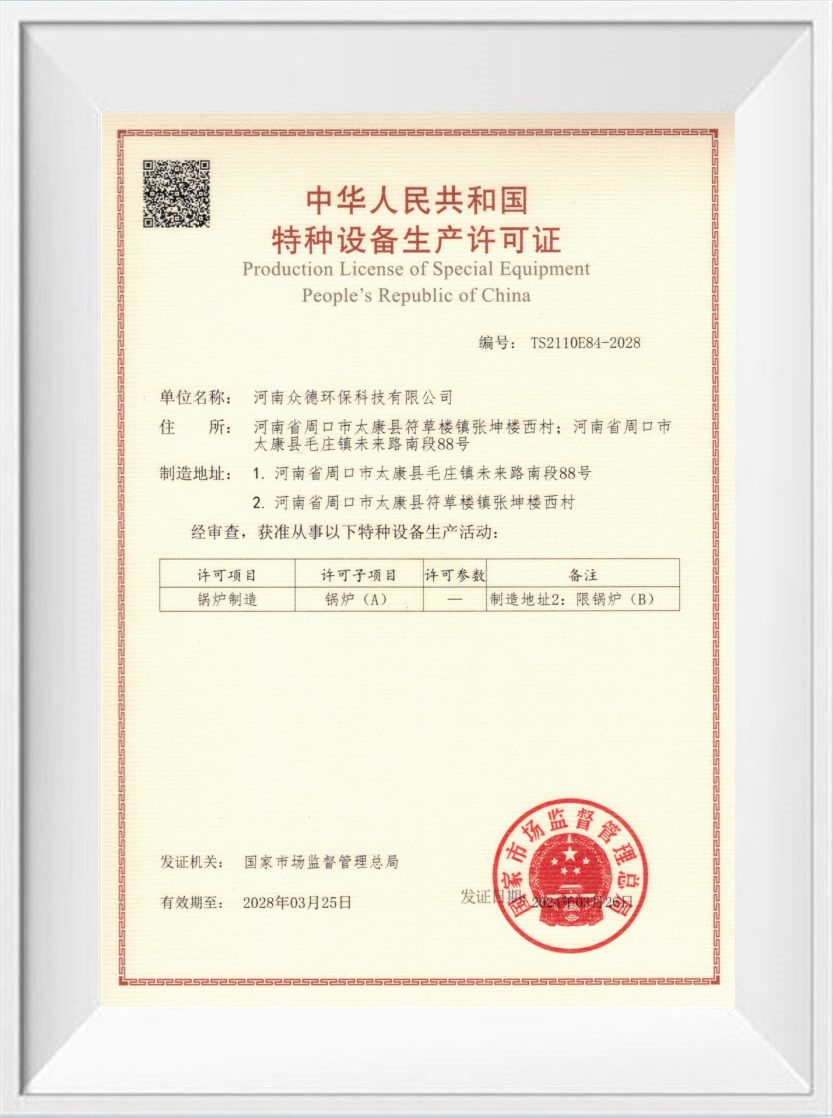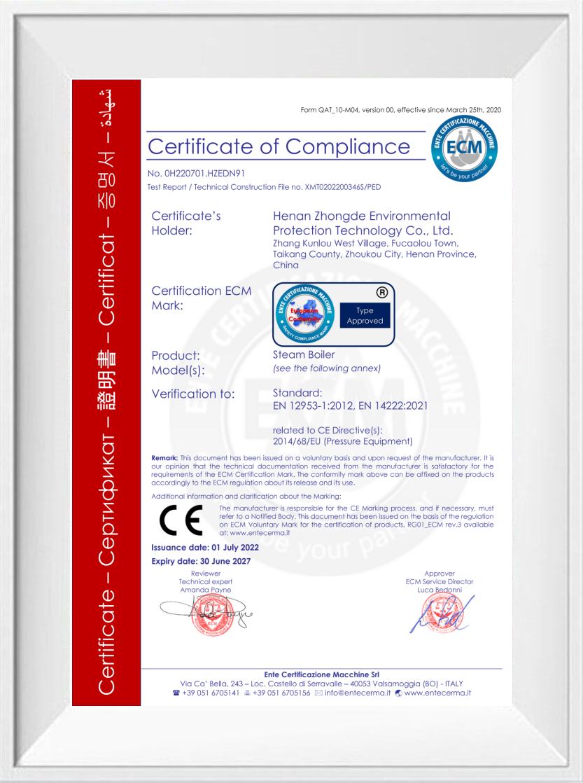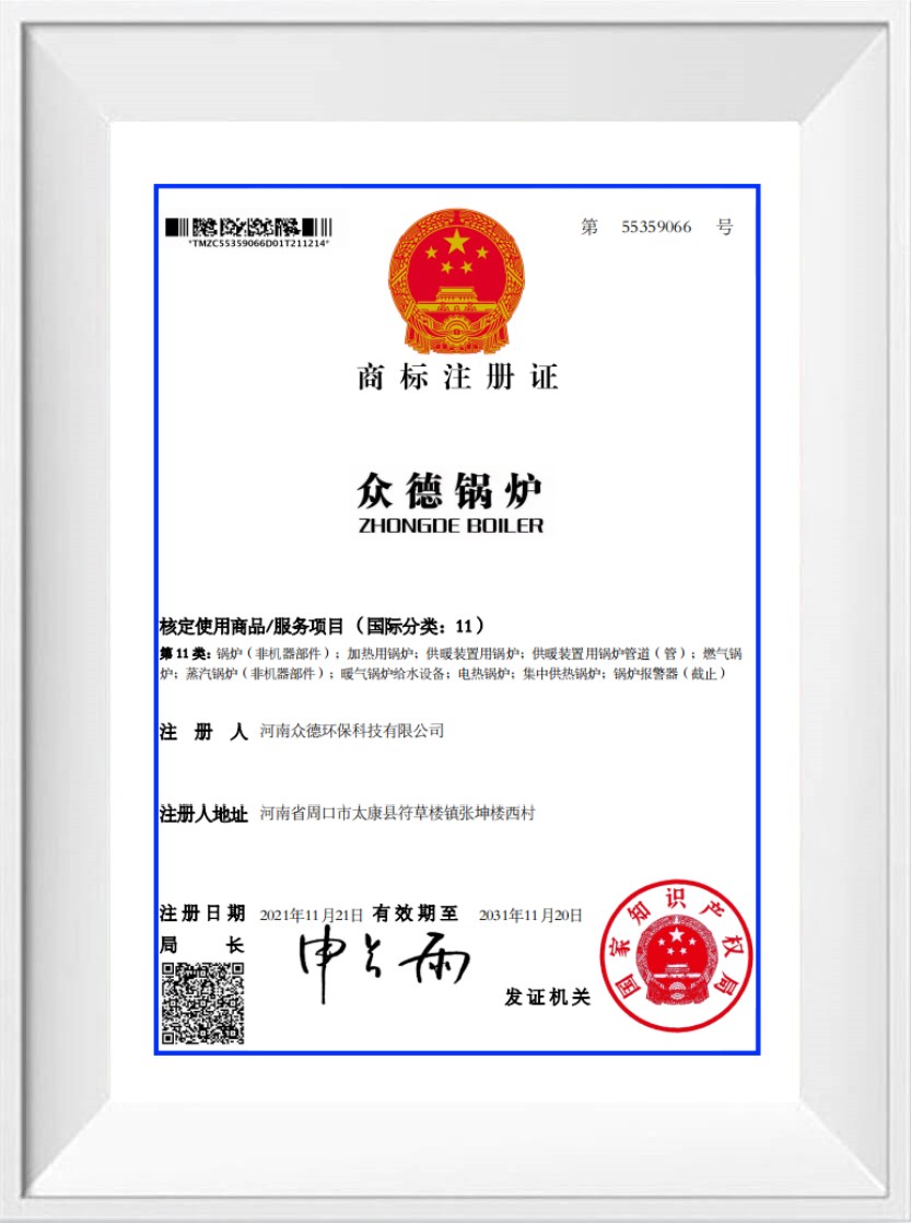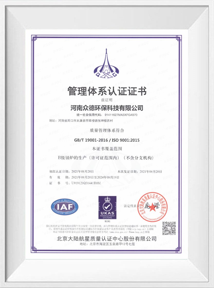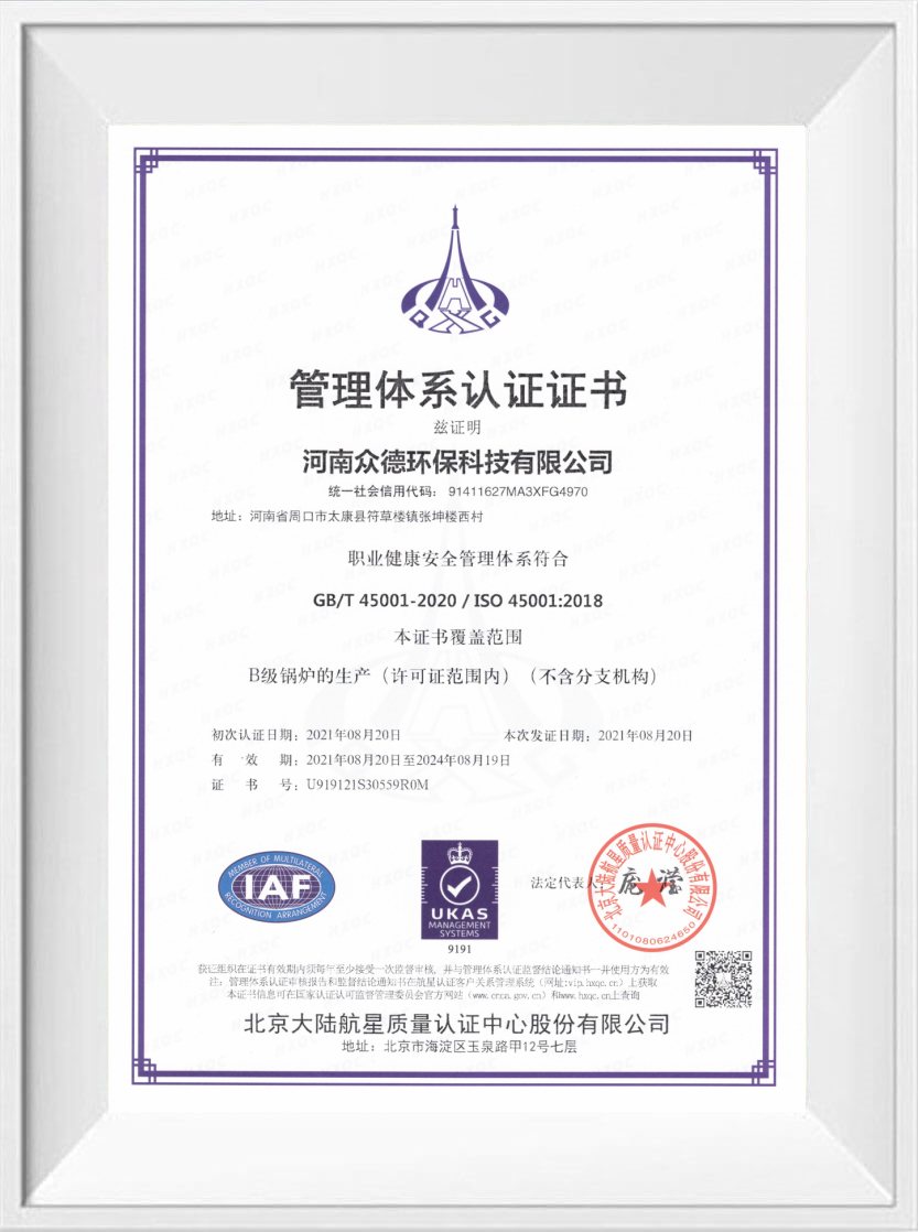 眾德鍋爐通過ISO9001質量管理體系認證,ISO14001環(huán)境管理體系認證,OHSAS18001職業(yè)健康安全管理體系認證,企業(yè)信用評級AAA認證。同時取得CE, EU, SASO, SONCAP, PVOC, COC, EAC等國際貿易通行證。多年來的不懈付出,使眾德鍋爐成為一家廣受認可和贊譽的企業(yè)。